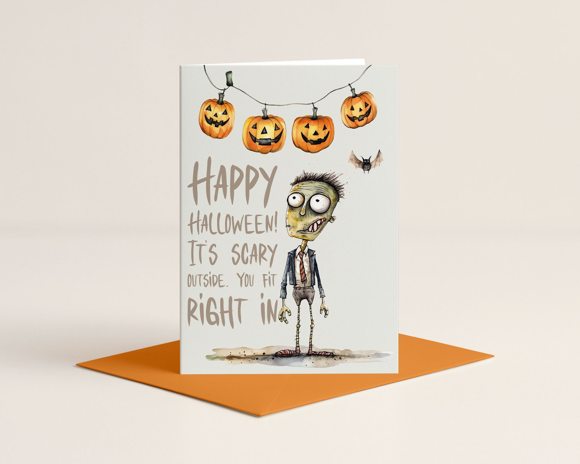 A Halloween card that doesn’t try to comfort you, quite the opposite: “It’s scary outside. You fit right in.” Featuring a zombie who looks like he just crawled out of a Zoom call, and a string of jack-o'-lanterns staring like they know your secrets. This card is a wink to the chaos outside, and inside.