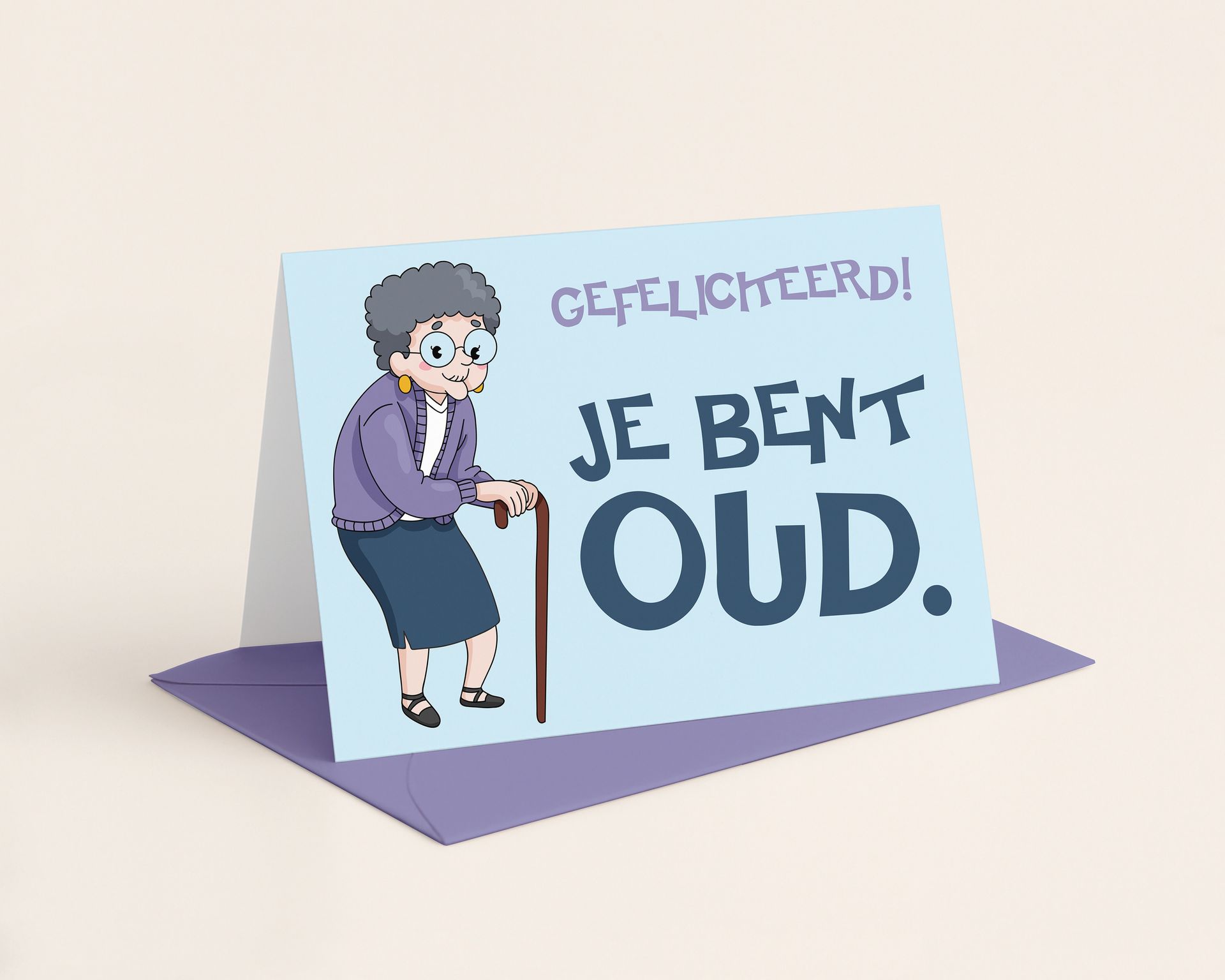 Een verjaardagskaart die geen omweg neemt: “Gefeliciteerd! Je bent oud.” Punt. Geen poespas, geen metaforen, gewoon een directe mededeling verpakt in pastelballonnen en een oma met attitude.
