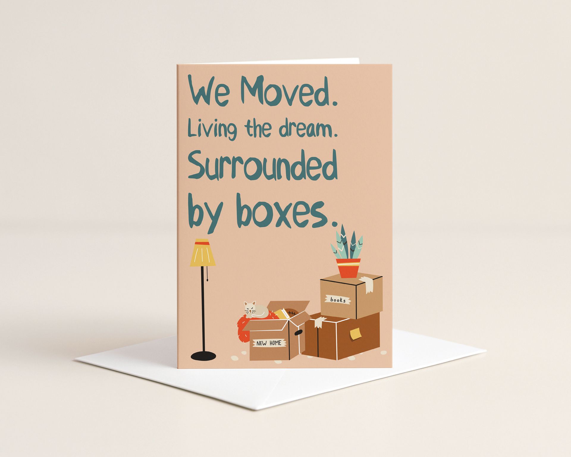 Een verhuiskaart die de waarheid niet verbloemt: “Living the dream. Surrounded by boxes.” Want ja, het nieuwe huis is fantastisch, als je de kat, de kamerplant en de lamp kunt vinden tussen de dozen. Met een illustratie van een kartonnen chaos en een kat die zich al heeft genesteld in z’n nieuwe koninkrijk, is deze kaart een ode aan het rommelige begin van iets moois.